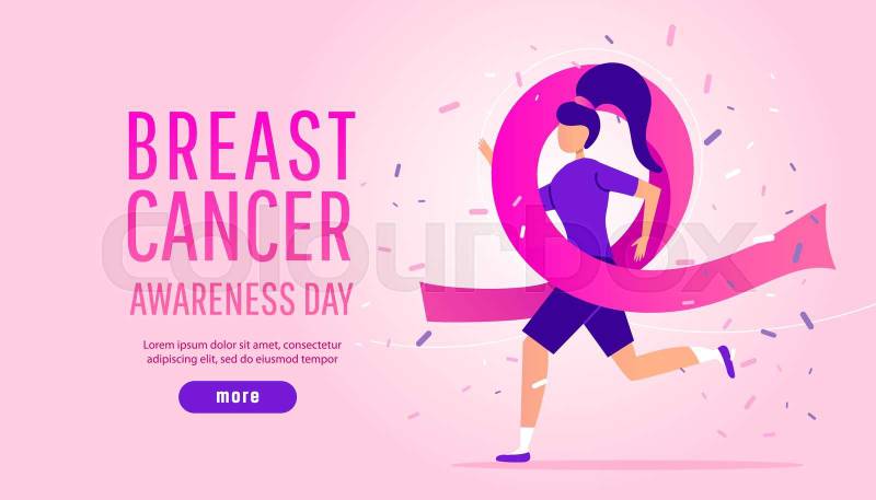 Creative winning concept of breast cancer awarenes ... s month. Young girl runs in a charity marathon with a pink ribbon on a gradient background.