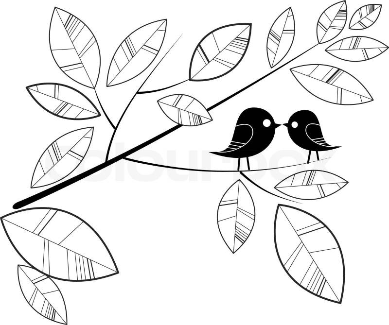cute little birds and stylized branch with leaves