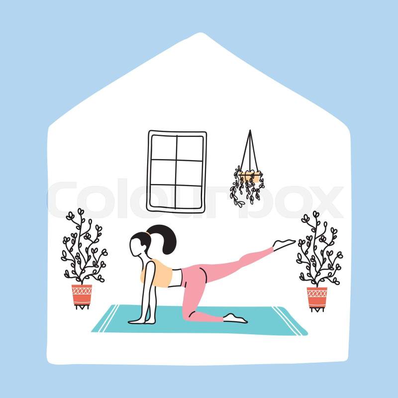 Stay home, young woman doing yoga, isolation and social distancing